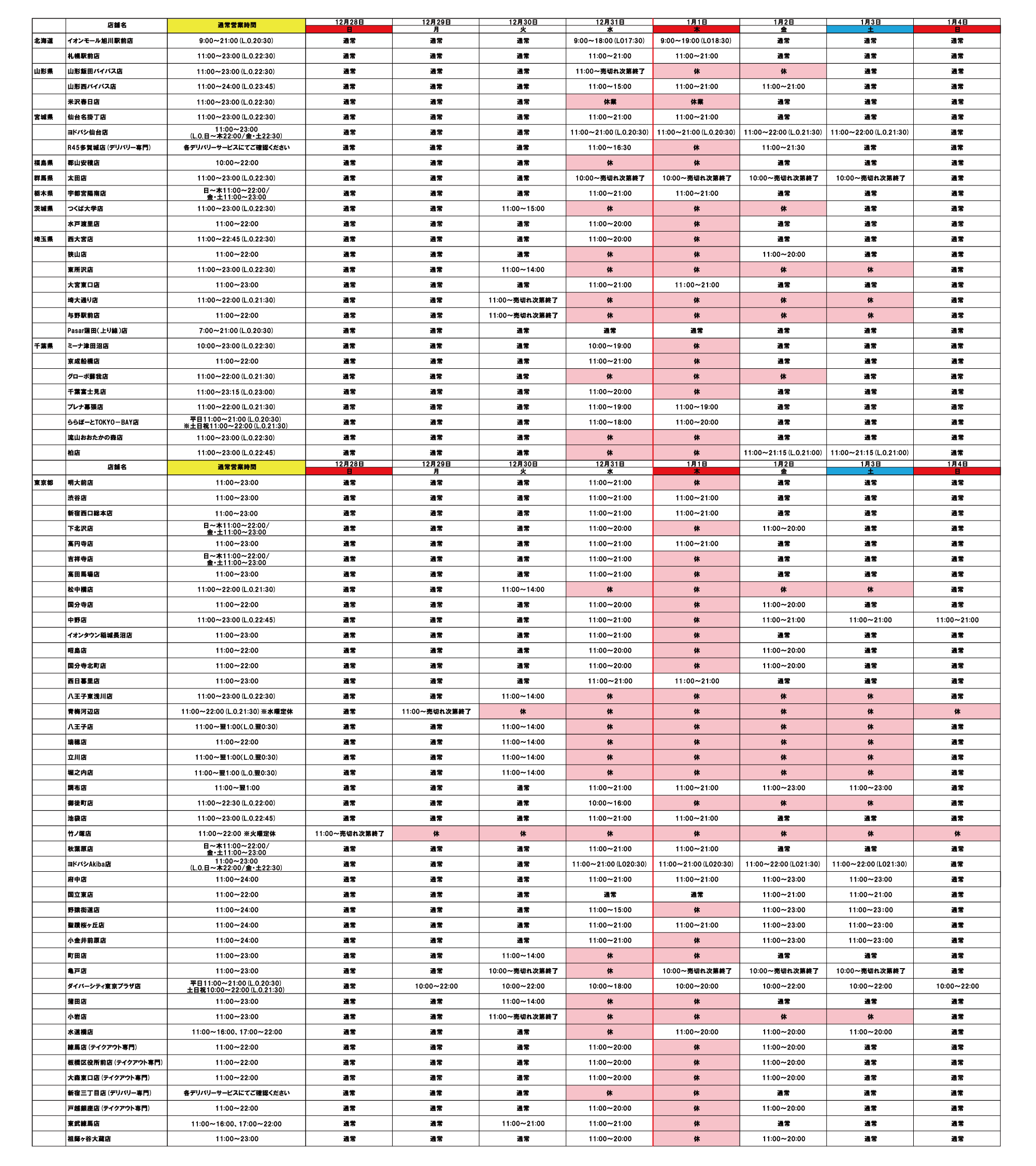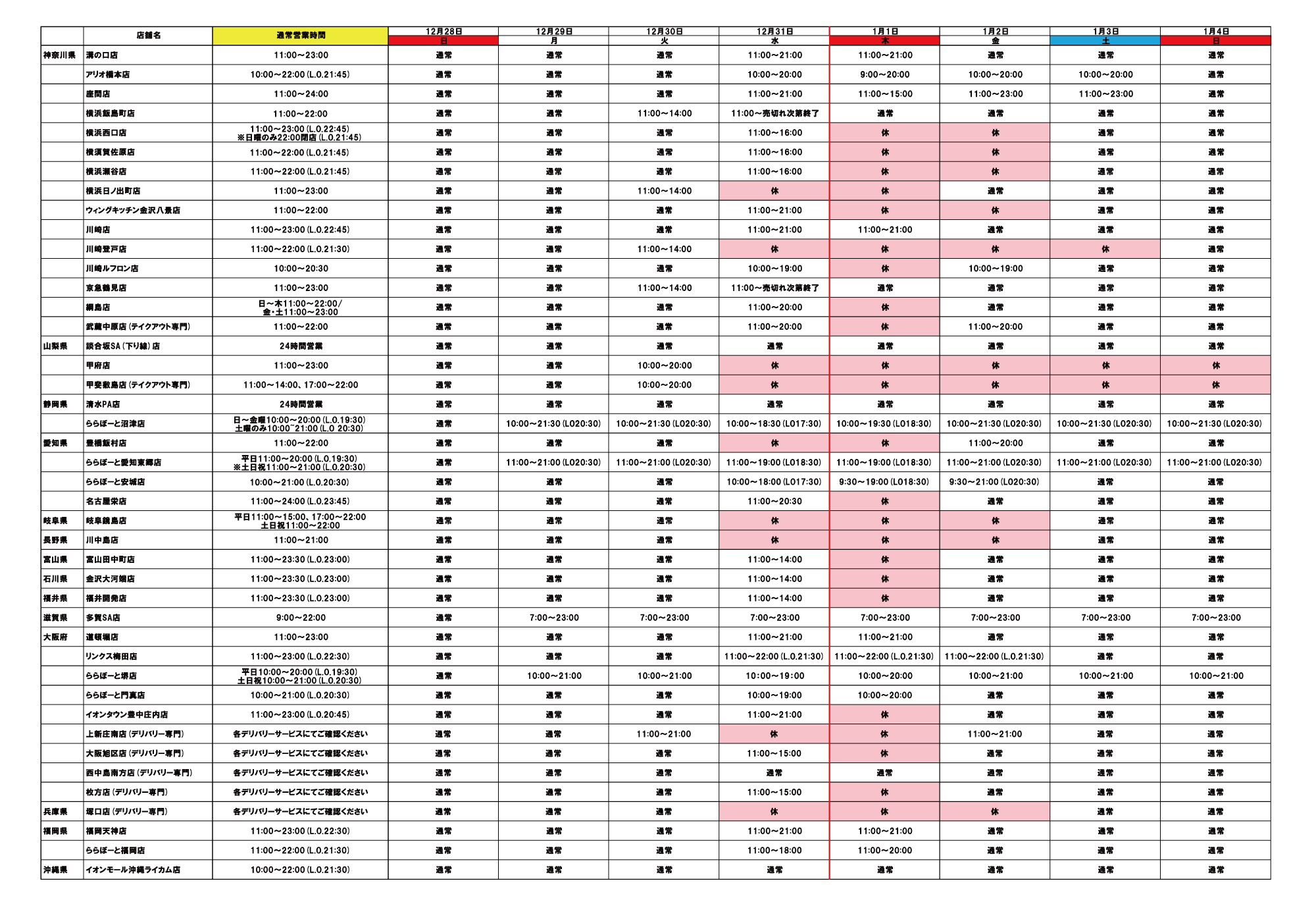 いつも当店をご利用いただき、誠にありがとうございます。 誠に勝手ながら、年末年始は一部店舗で短縮営業・休業させていただきます。 詳細は下記の表をご覧ください。 なお、各店翌営業日からは通常通り営業いたします。
